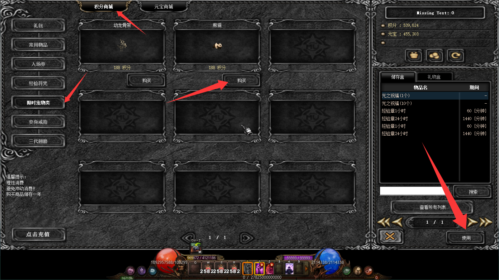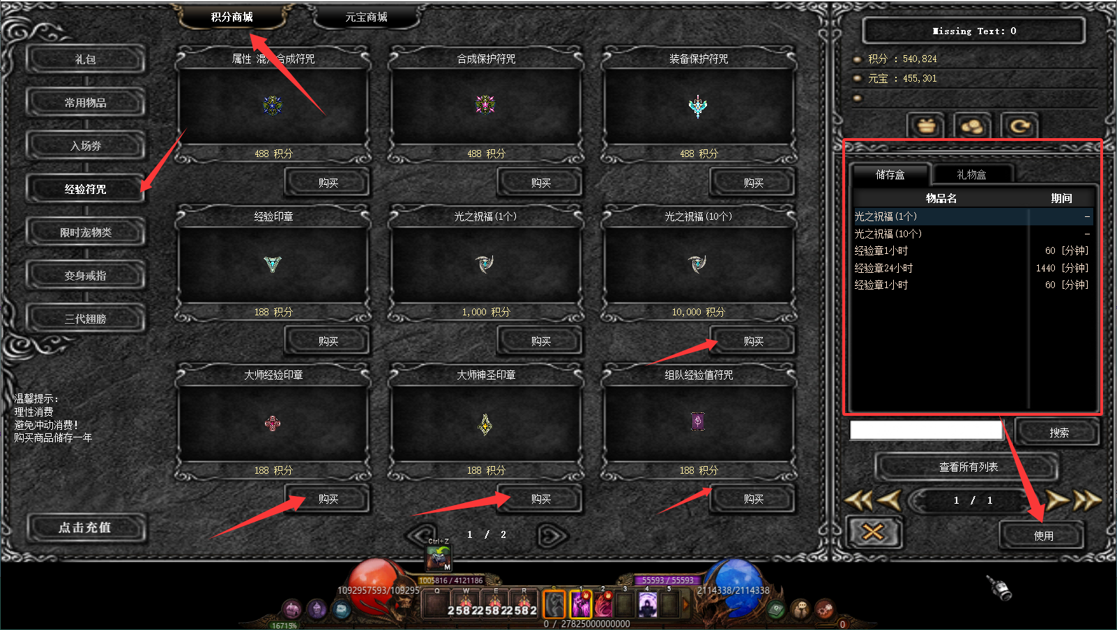 X商店→积分商城→经验符咒→光之祝福→大师经验印章→大师神圣印章→组队经验值符咒→使用